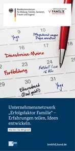 - Info-Materialien und Checklisten: frei Haus geliefert! Anregungen, Tipps und Informationen rund um die Vereinbarkeit von Familie, Pflege und Beruf – insbesondere für kleine und mittlere Unternehmen