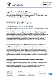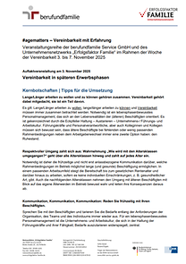 Die Webinar-Reihe #agematters im Rahmen der Woche der Vereinbarkeit hat deutlich gemacht, dass längere Erwerbstätigkeit von älteren Beschäftigten nur gelingt, wenn Vereinbarkeit mitgedacht wird. Ausschlaggebend ist, dass Unternehmen ein lebensphasenbewusstes Personalmanagement etablieren, das sich an den Realitäten aller Beschäftigten orientiert. Haltung, Unternehmenskultur und Kommunikation spielen dabei eine zentrale Rolle.