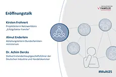 Die Dokumentation der Veranstaltung ist nun in der Mediathek abrufbar. Sie beinhaltet den vollständigen Mitschnitt des Eröffnungstalks mit der Leiterin der Abteilung Familie im Bundesbildungs- und familienministerium, Almut Enderlein, und dem stellvertretenden DIHK-Hauptgeschäftsführer, Dr. Achim Dercks, des Fachimpulses sowie der Podiumsdiskussion. Zusätzlich stellen wir Ihnen die Vortragsfolien und Ergebnisse der Sli.do-Fragen zum Download zur Verfügung, siehe Anlage unten.